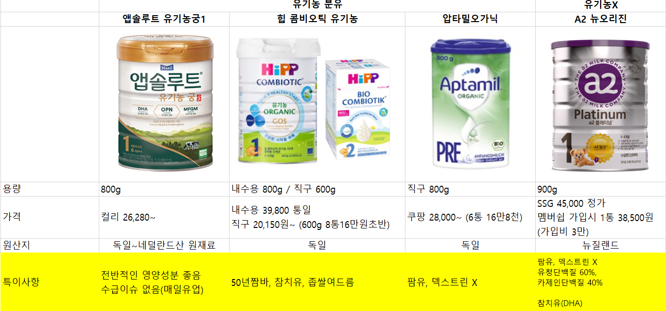 아기 분유비교 분유고르기 (앱솔루트궁/힙 콤비오틱 유기농/압타밀 오가닉/A2 뉴오리진)