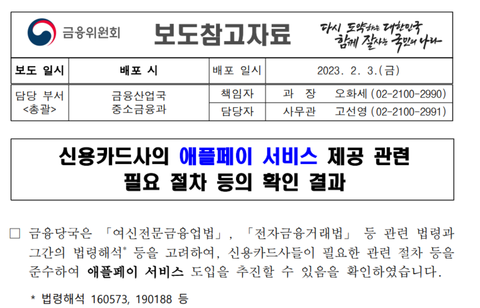 금융당국에서 애플페이 서비스가 최종승인이 났다. 신용카드사의 애플페이 서비스 제공 관련 필요 절차 등의 확인결과에 따르면 금융당국은 그간의 법령해석등을 고려하여 신용카드사들이 필요한 관련 절차 등을 준수하여 애플페이 서비스를 도입할 수 있도록 확인했다. 애플 또한 국내 출시를 공식화 했다. 애플페이의 수수료는 건당 최대 0.15% 정도라고 한다.