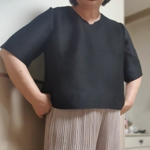 모니카제이의 플리츠 반팔입니다. 이 블라우스 보고 너무 핏이 좋아서 반해버린 그런 쇼핑몰인데요. 모니카제이의 60대 여성의류 쇼핑몰로 어머님들 여름 블라우스로 추천드립니다. 너무너무 시원해보이는 소재이고, 하늘하늘한 소재라서 체형커버도 됩니다.